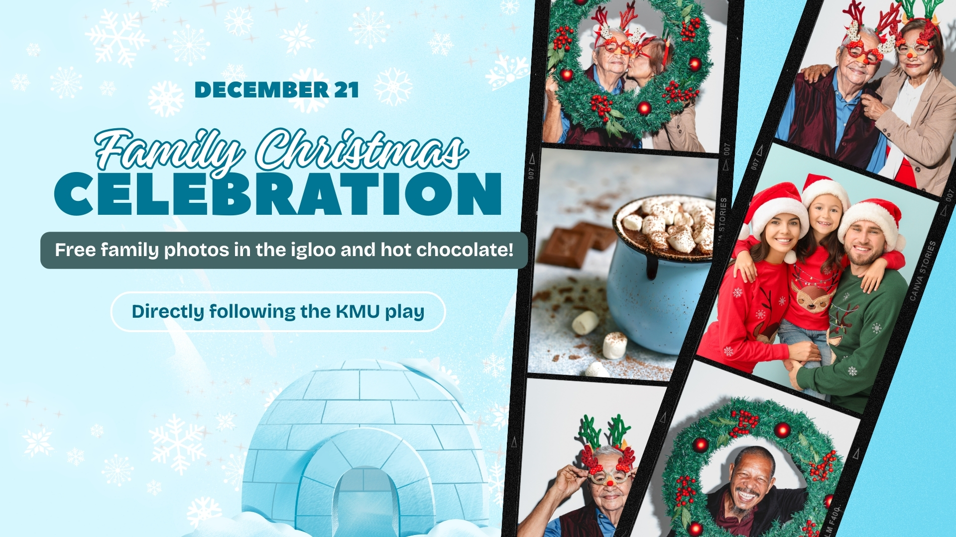 After our KMU Christmas Program, we invite you and your family to stay for a cozy and joy-filled gathering! Step inside our festive igloo for special family photos, enjoy a cup of free hot chocolate, and share in the warmth and fun of the season with our church family.